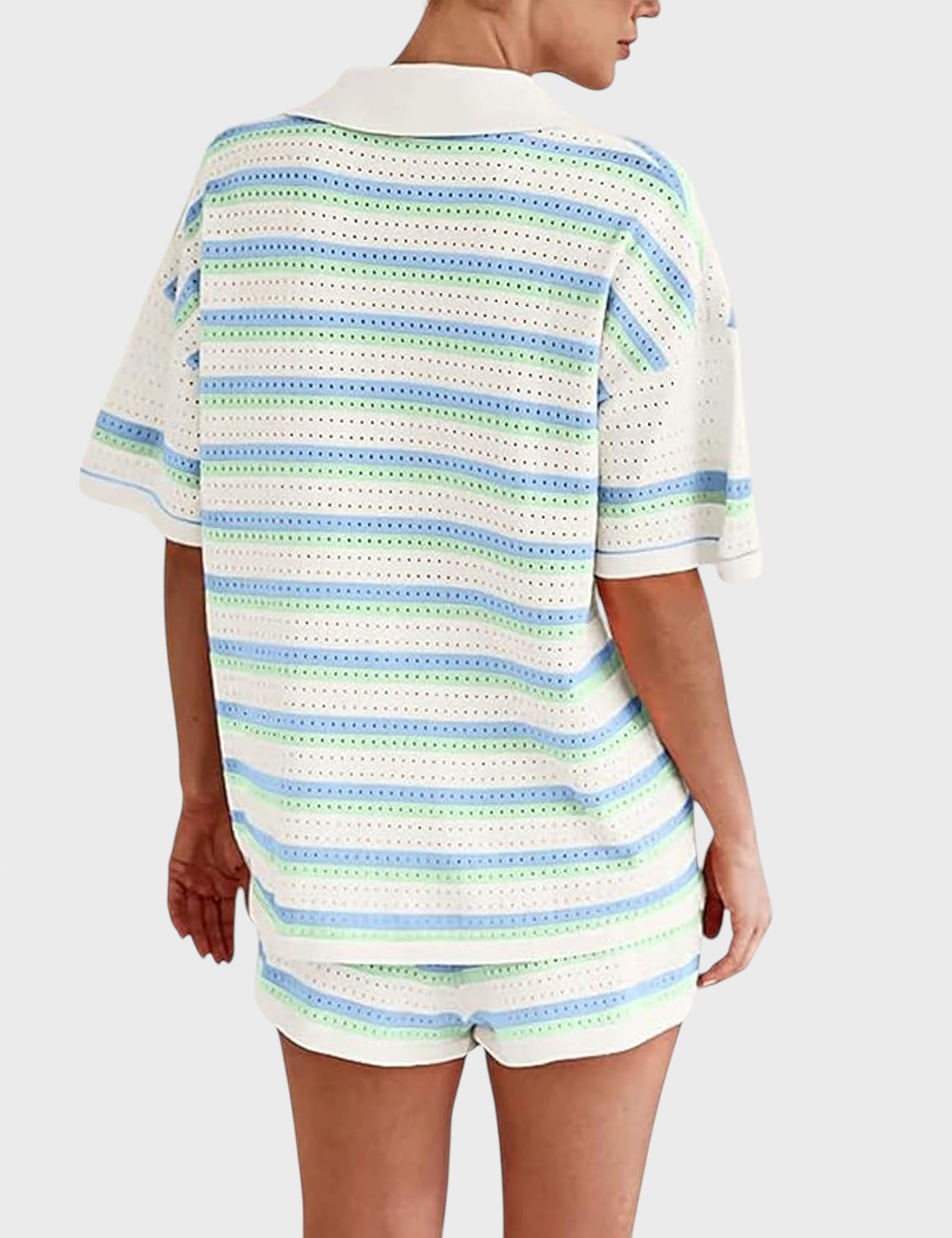 Със своя летен дизайн и дишаща материя, този комплект добавя слънчево излъчване към всеки повод. Този комплект е не само стилен, но и невероятно удобен, идеален за всеки повод. Независимо дали отивате на плаж, обядвате с приятели или се разхождате из града, този комплект предлага удобно прилягане и безспорно модерен стил.