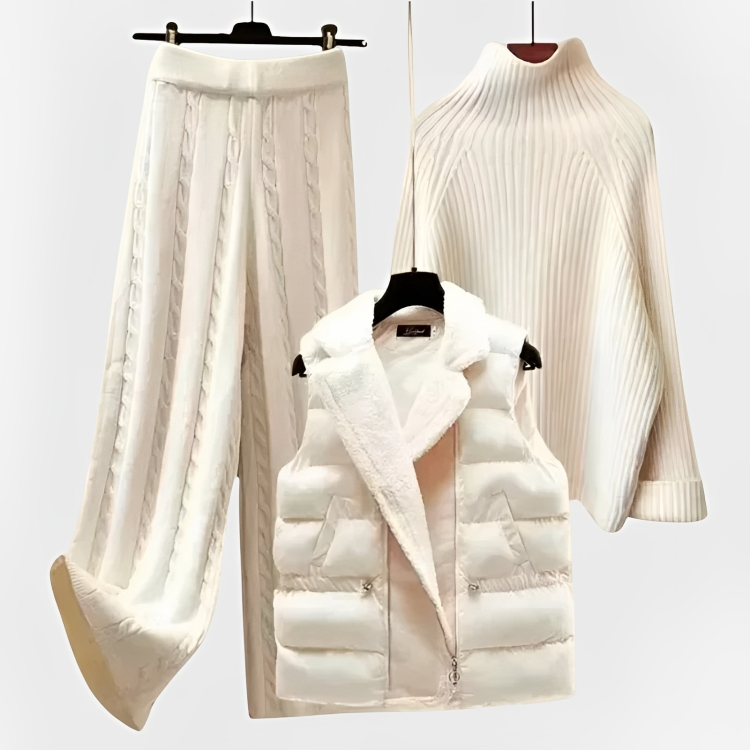 - Луксозен комплект за съчетаване (3 в 1): Това е цялостно решение за стилизиране на всичко. Включва плетен пуловер с оребрена яка , плетен панталон с широки крачоли и ватиран жилет с детайл от изкуствена кожа. Всички кремави артикули предлагат изключително изтънчен монохромен вид .
