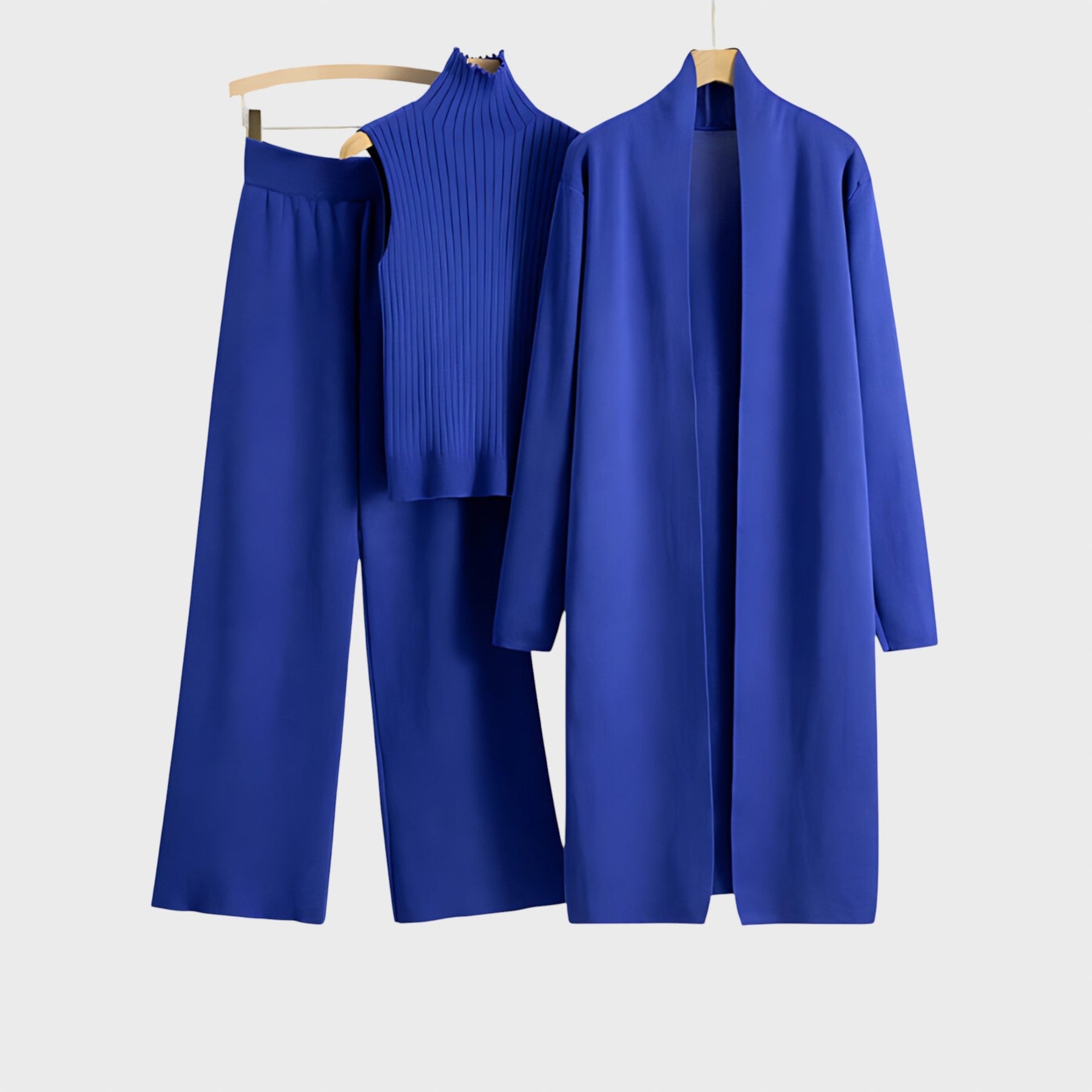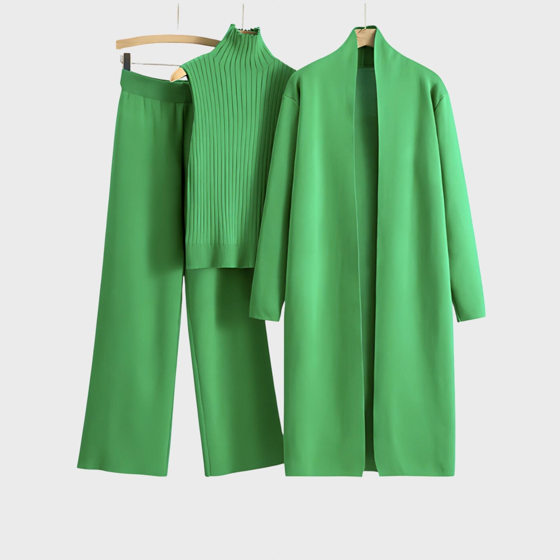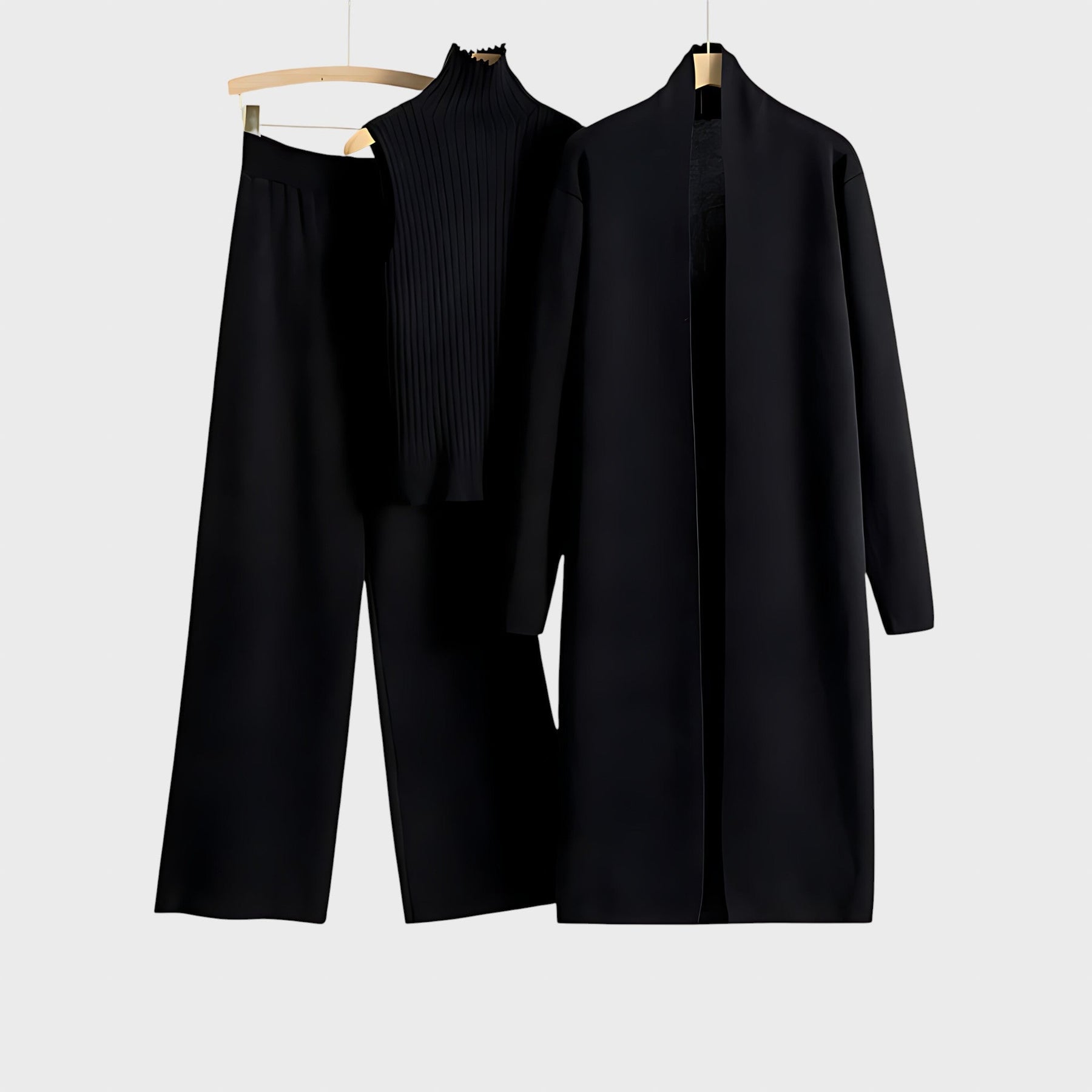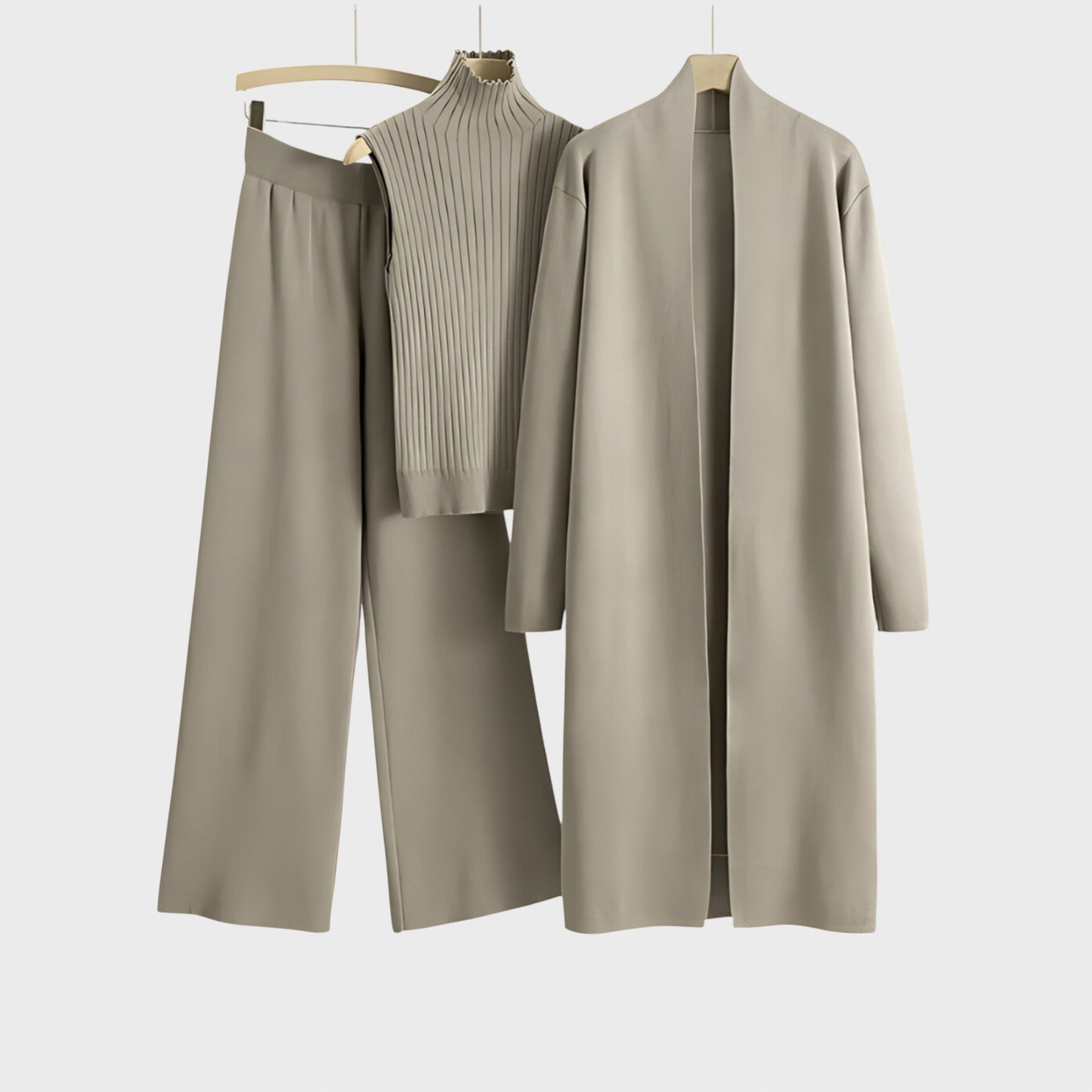 - Универсалност на наслояването: И трите части са задължителни и могат да се носят заедно, по двойки или поотделно. Дългото палто и оребреният топ са идеални преходни елементи, които могат да се носят върху или под други дрехи през всеки сезон.