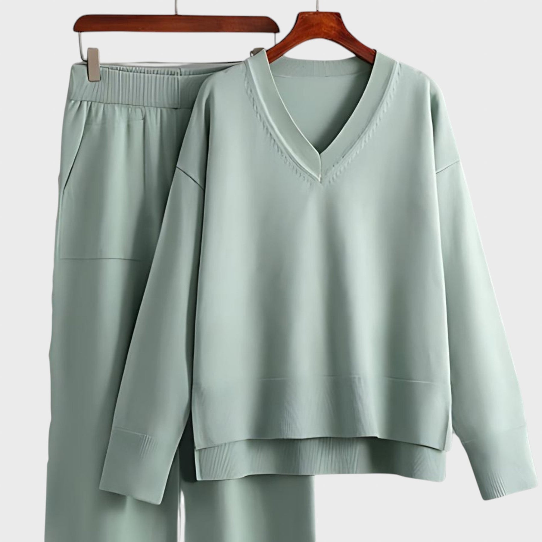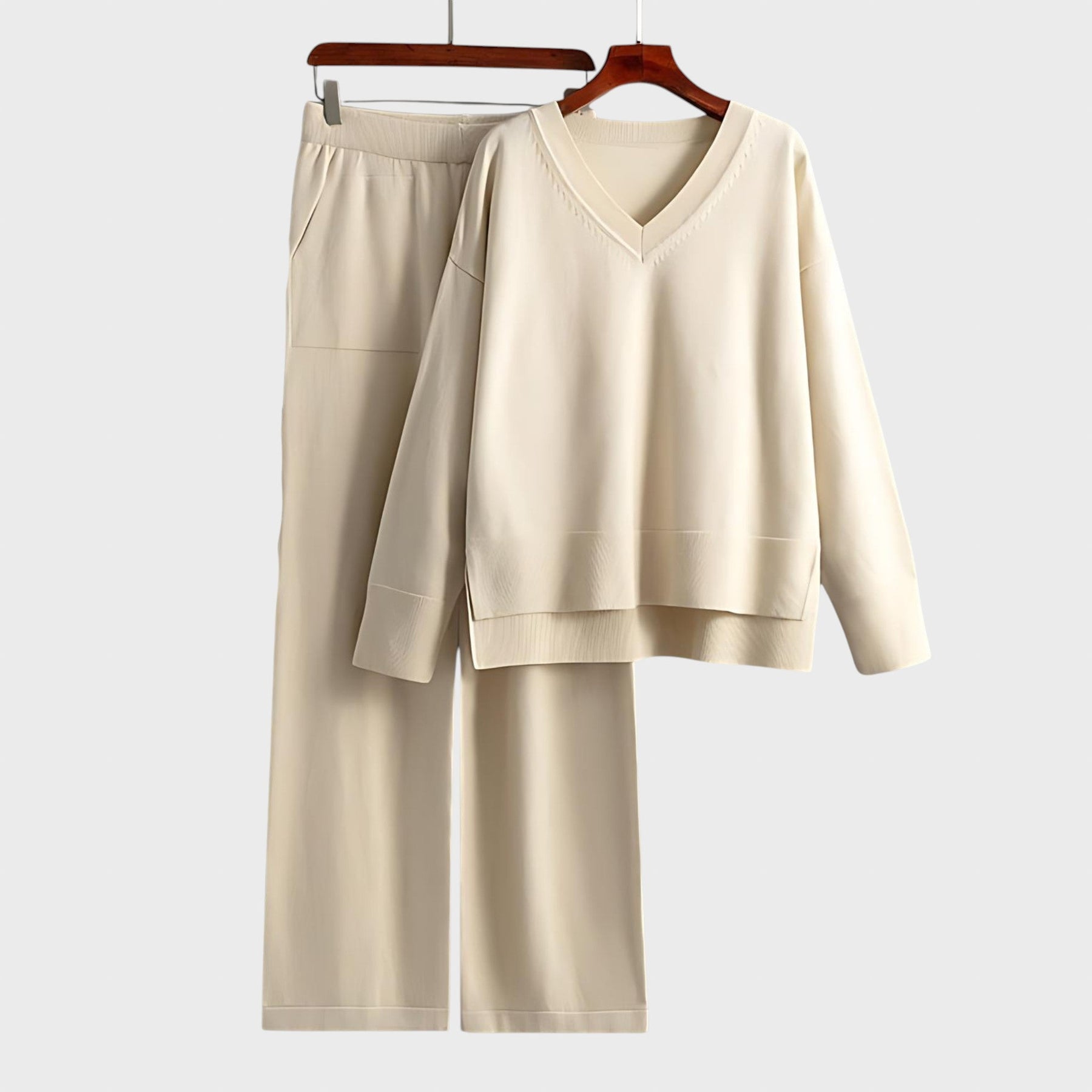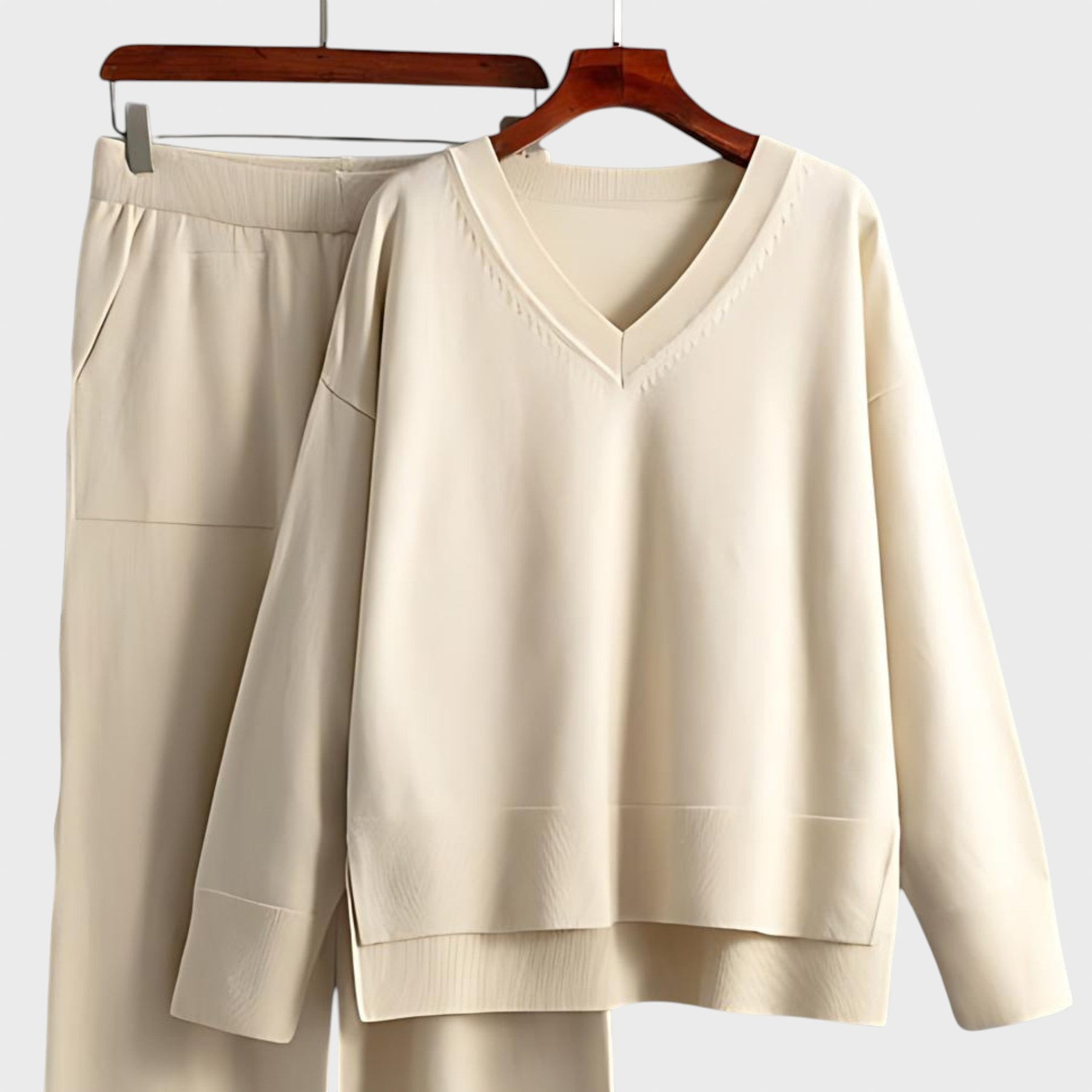 Изработен от смес от меки, дишащи материи, този комплект гарантира комфорт през целия ден, като същевременно ви прави стилни без усилие. Пуловерът с V-образно деколте и джогър панталонът с висока талия и връзки създават перфектната комбинация от ежедневна кройка и изискан стил. Свободният горнище и широките панталони предлагат ласкателен силует за всички типове тяло.