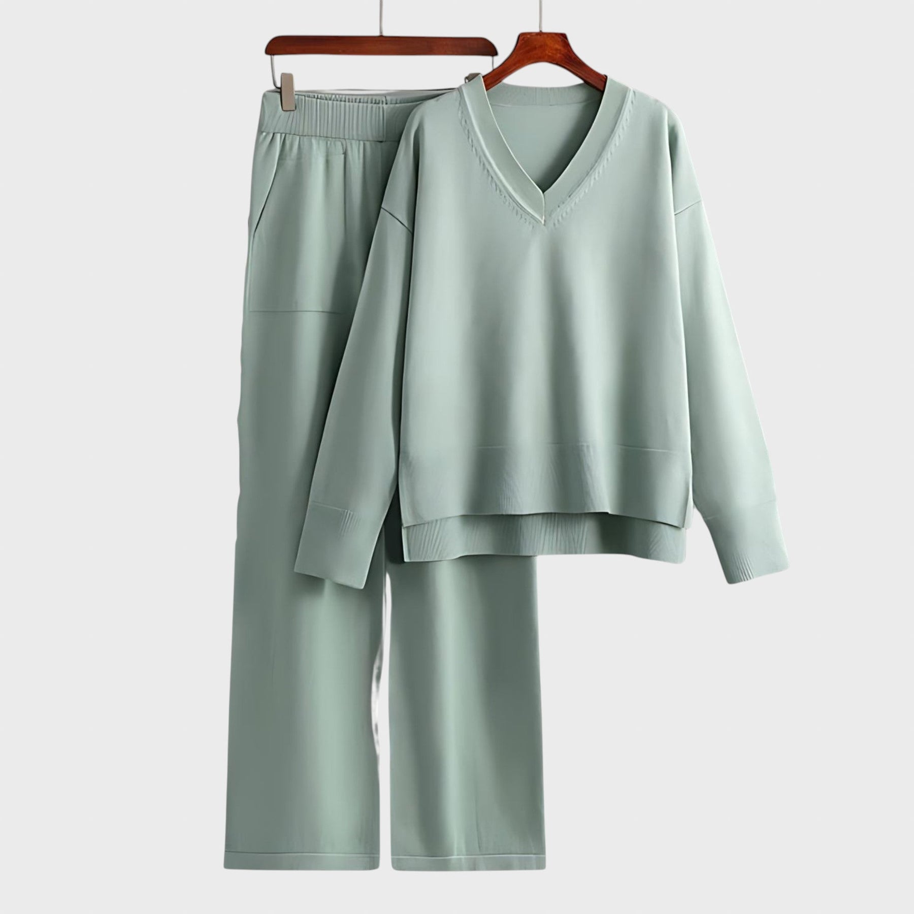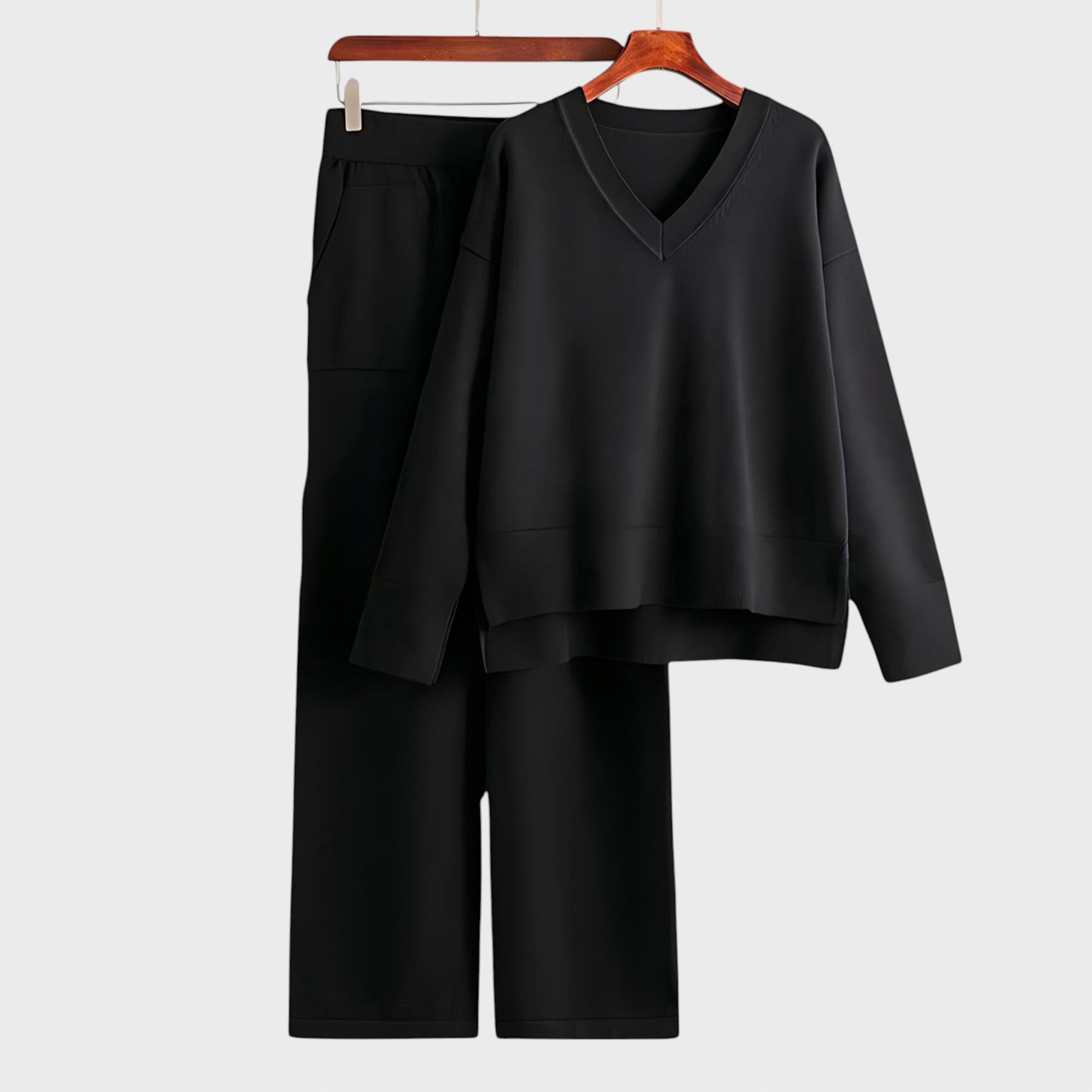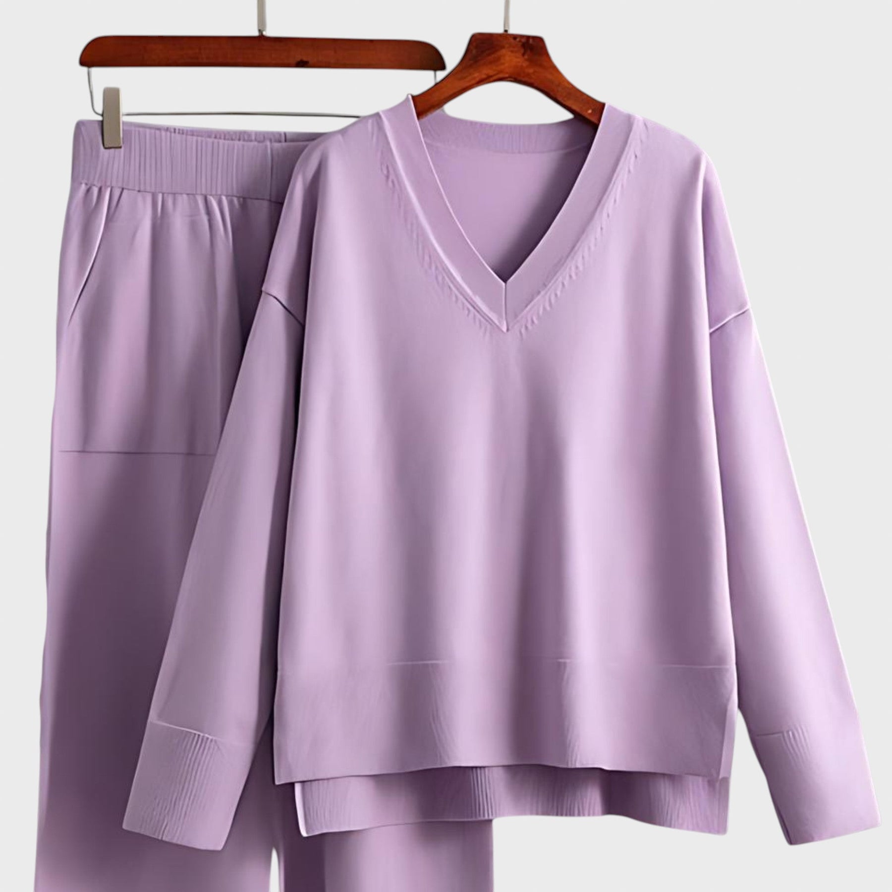 Изработен от смес от меки, дишащи материи, този комплект гарантира комфорт през целия ден, като същевременно ви прави стилни без усилие. Пуловерът с V-образно деколте и джогър панталонът с висока талия и връзки създават перфектната комбинация от ежедневна кройка и изискан стил. Свободният горнище и широките панталони предлагат ласкателен силует за всички типове тяло.