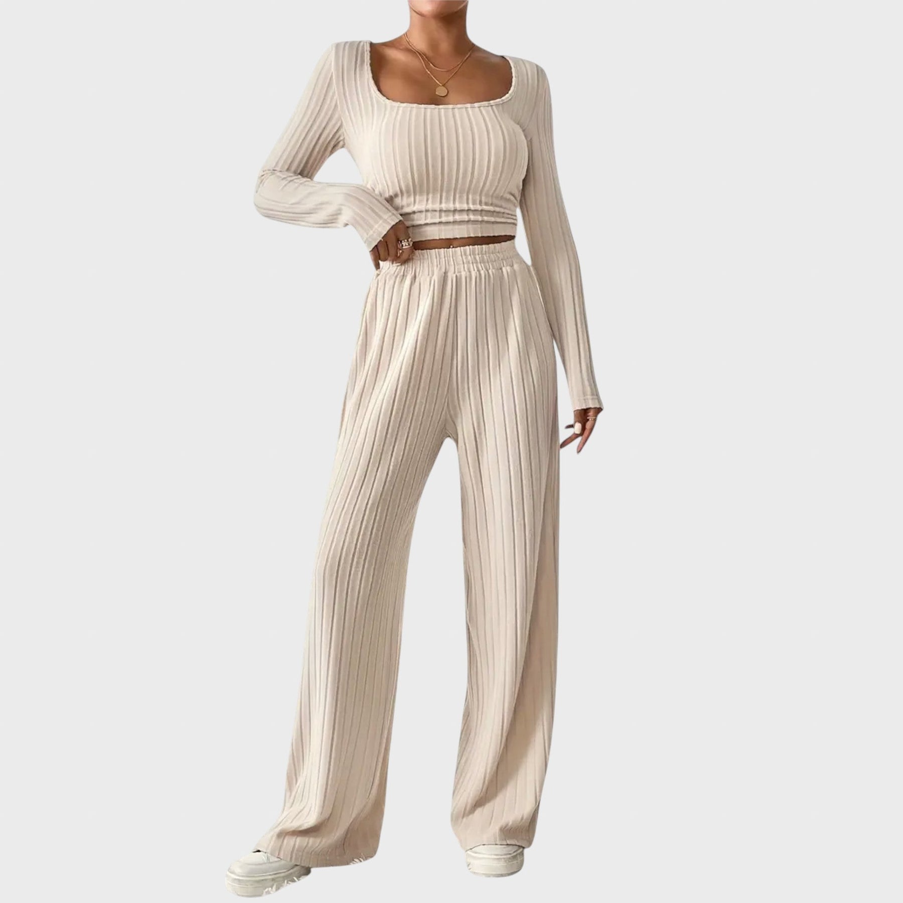 - Дизайн: Дългите ръкави на късия топ добавят женствен щрих към визията ви. Елегантната кройка подчертава силуета ви и създава стилно изявление, идеално за хладни дни. Широките панталони предлагат максимален комфорт и свобода на движение. Високата талия подчертава силуета и хармонично допълва визията.