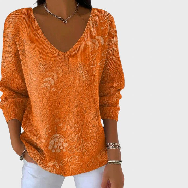 Този пуловер е перфектният избор за спокоен есенен стил, с елегантно V-образно деколте и свободна кройка за комфорт през целия ден. Съчетавайки топъл цвят с богата текстура и семпли дизайнерски детайли, тази дреха е идеална за освежаване на вашия есенно/зимен гардероб.