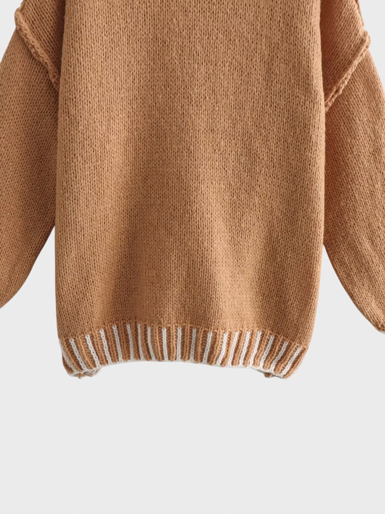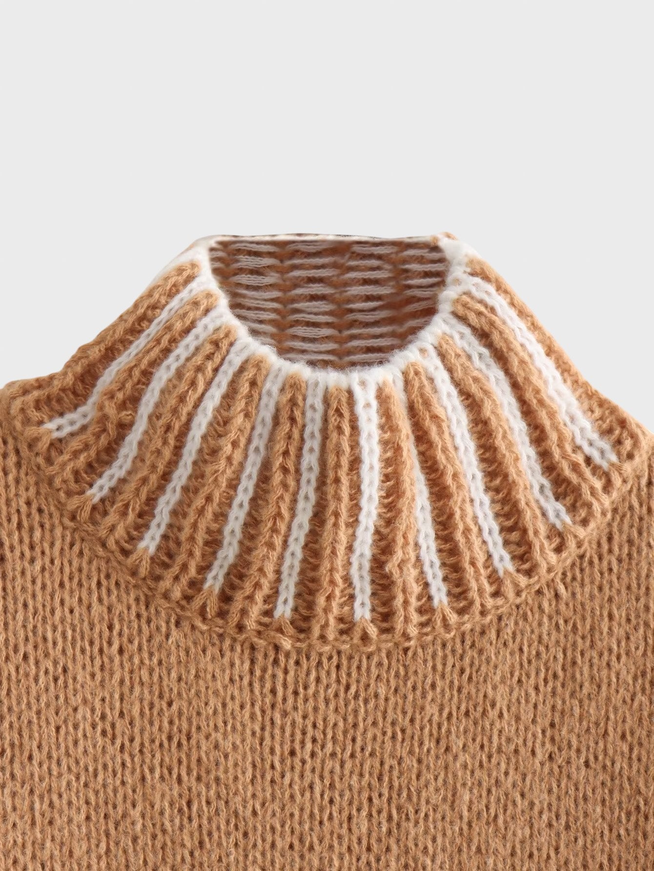• Класическа и елегантна кройка: Пуловерът е с оувърсайз дизайн за свободна и удобна кройка. Детайлите добавят нотка елегантност: високата яка, контрастните бели райета на маншетите и подгъва, както и широките балонни ръкави, подсилват обемната, модерна естетика.