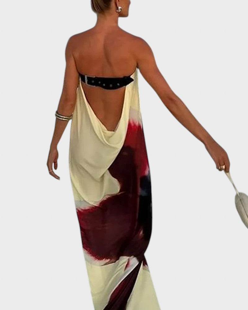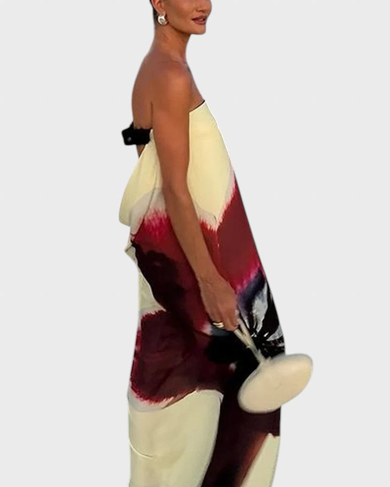 - Впечатляващ абстрактен принт: Принтът е сърцето на тази рокля. С големите си, плавни щрихи в нюанси на кремаво, наситено бордо и черно (или тъмни тонове), той извиква усещане за модерно изкуство и страст. Това е визия, която привлича погледите и ви гарантира, че сте център на вниманието.