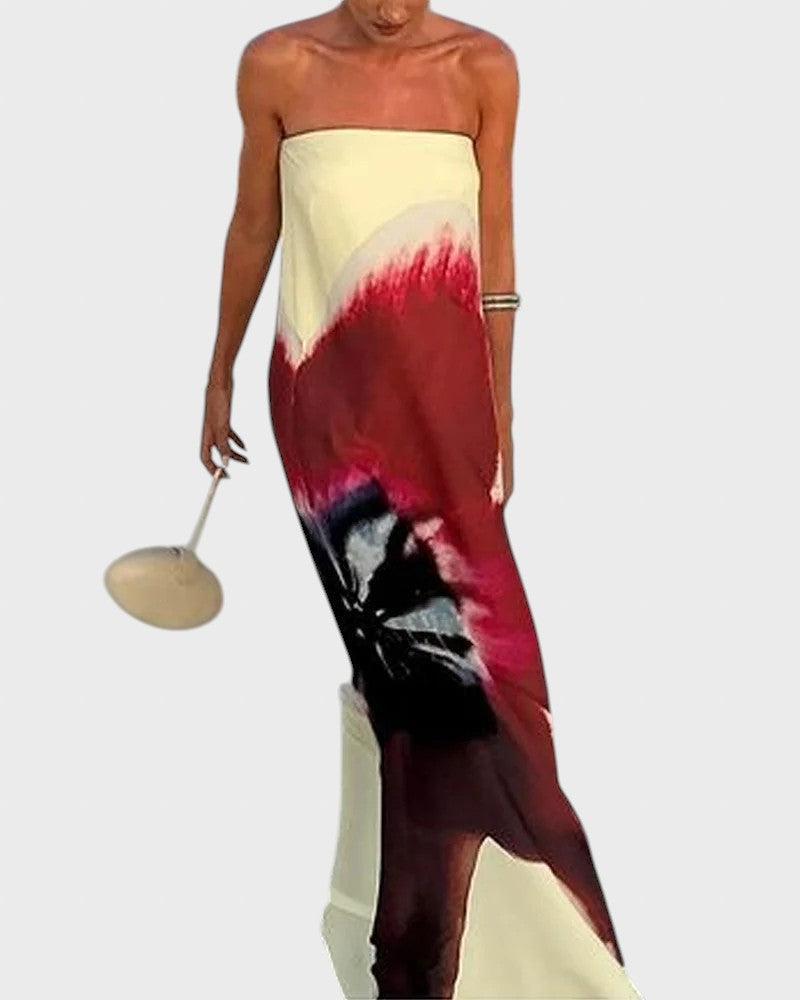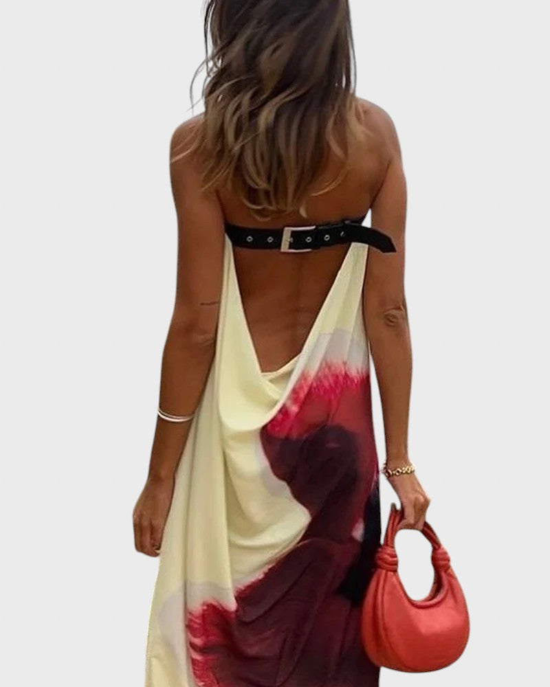 Нека артистичната смелост се срещне с непринудена елегантност в тази великолепна рокля. Тази рокля е платно от богати цветове и минималистичен дизайн, идеална за тези, които искат визия , която е едновременно впечатляваща и удобна. Тя е перфектната дреха за летни вечери, коктейли по залез слънце или морски бягства. Добавете аура на модерна изтънченост и нотка драматичност към вашия стил.