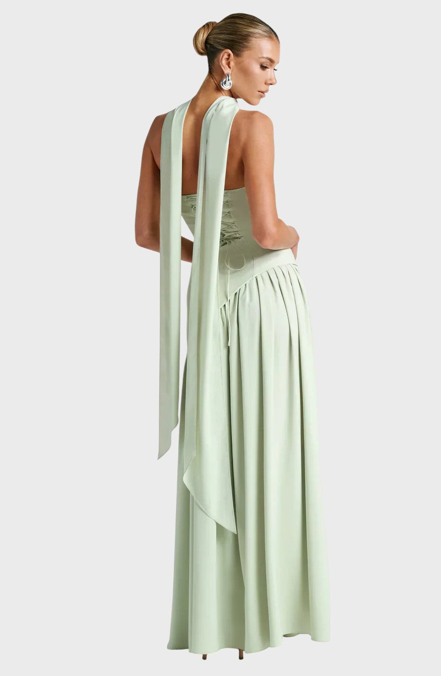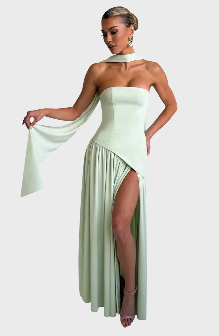 • Универсален и вечен дизайн: Роклята е със структурирана, асиметрична талия, която пада ниско върху ханша, създавайки елегантно наслояване. Дългата, ефирна пола осигурява леко и драматично движение с всяка стъпка.