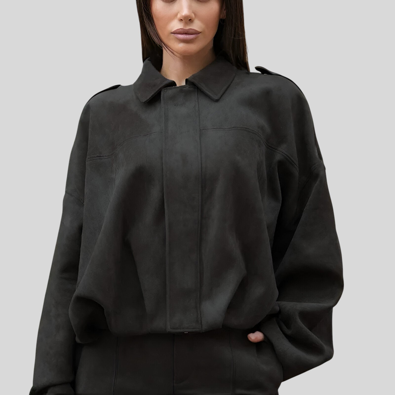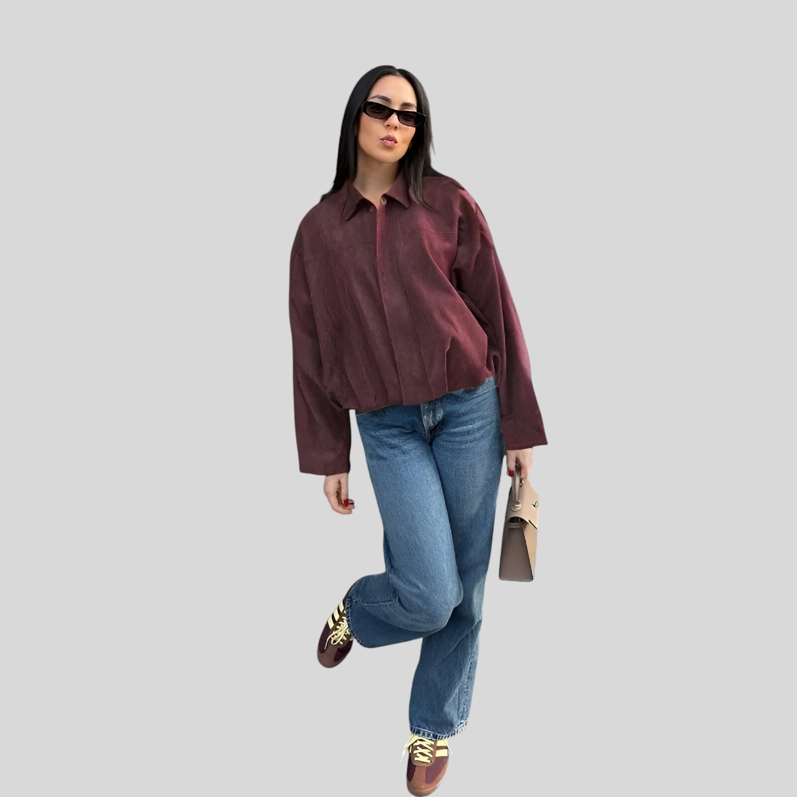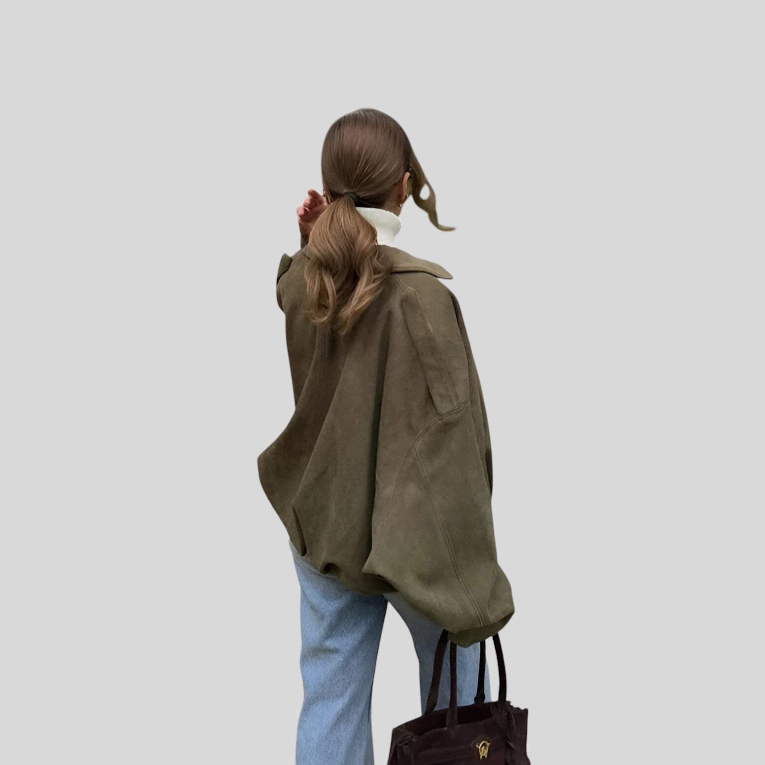 Нека спокойният комфорт се срещне с тактилната елегантност с това модерно велурено палто с голям размер . Мекият, удобен материал и изчистените линии му придават вечен характер, а по-свободната кройка осигурява свобода на движение. То е перфектният избор както за градски бягства, така и за елегантни ежедневни визии.