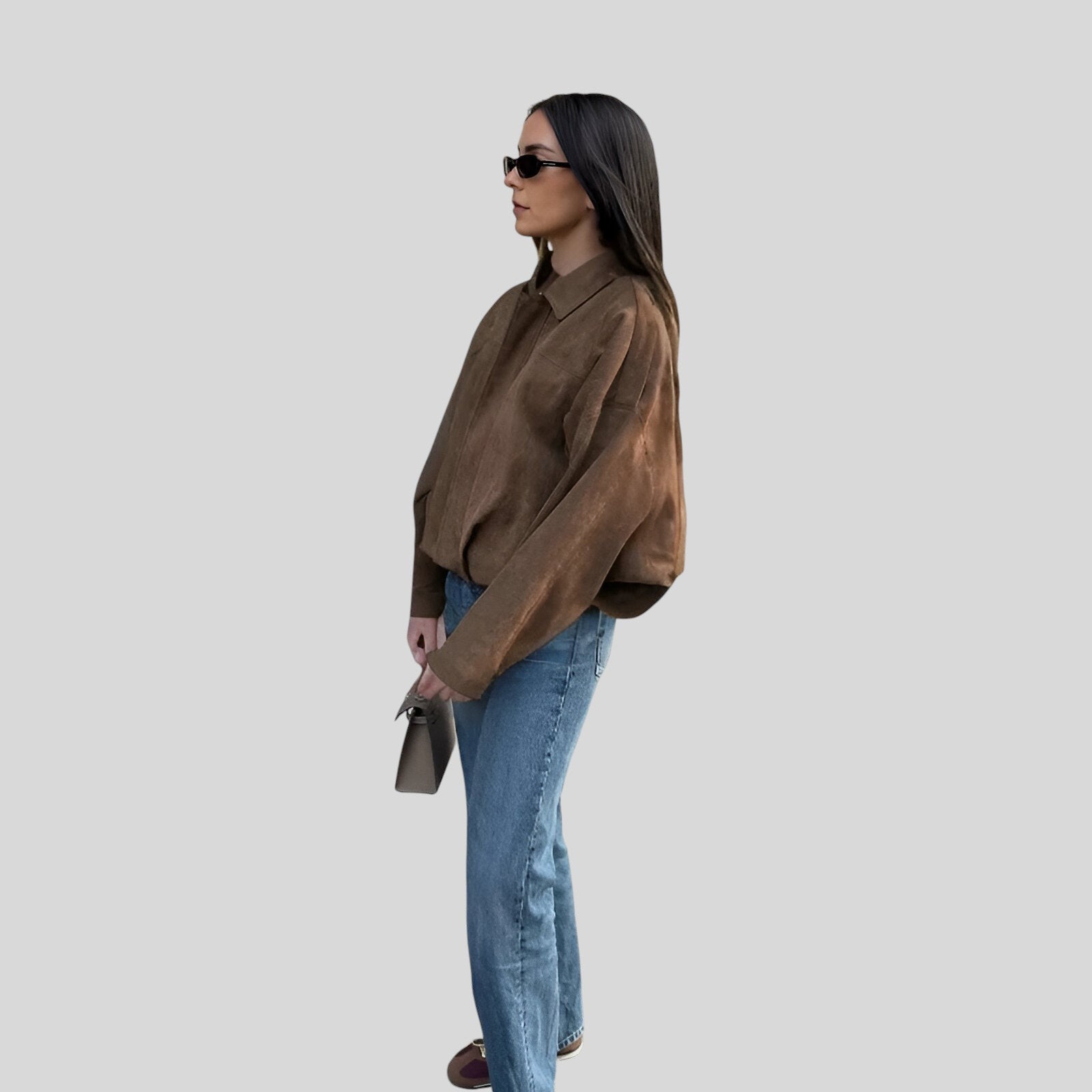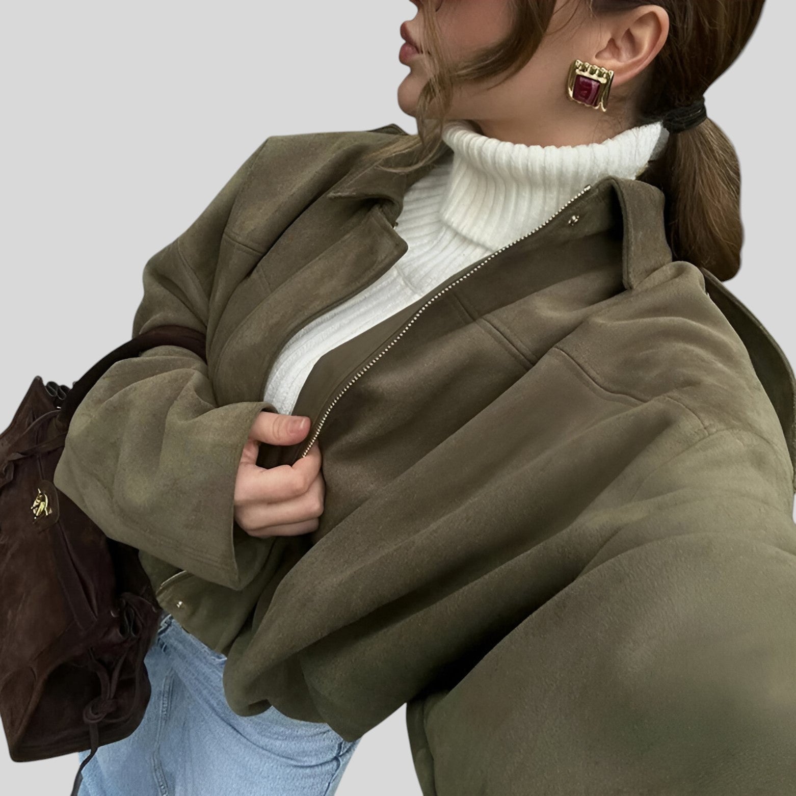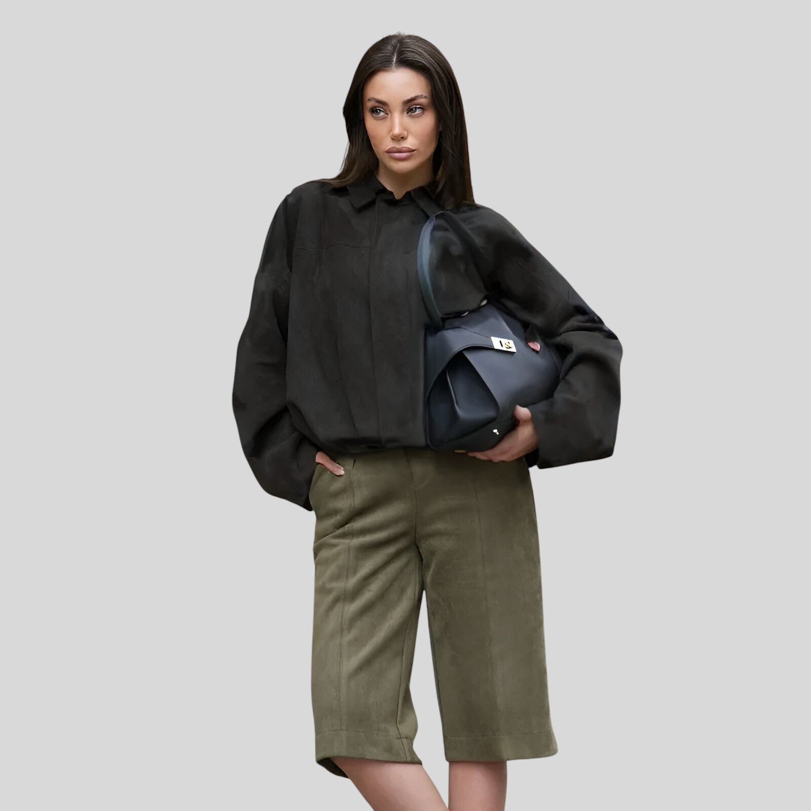 Нека спокойният комфорт се срещне с тактилната елегантност с това модерно велурено палто с голям размер . Мекият, удобен материал и изчистените линии му придават вечен характер, а по-свободната кройка осигурява свобода на движение. То е перфектният избор както за градски бягства, така и за елегантни ежедневни визии.
