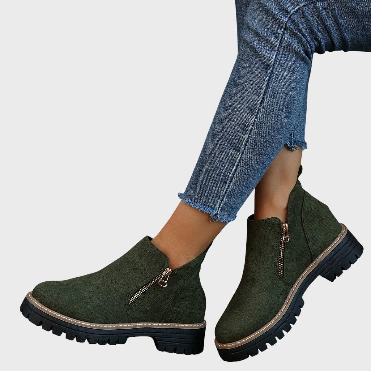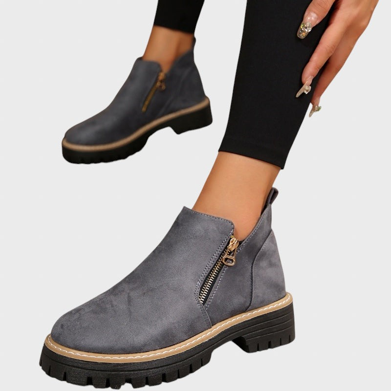 Тези ботуши се открояват с елегантния си дизайн със заоблен връх и своята универсалност, като се съчетават лесно с панталони, рокли или дънки. Неутралните цветове се адаптират към всеки сезон, а ергономичната конструкция осигурява естествена опора и комфорт без точки на натиск. Меката стелка разпределя теглото равномерно, намалявайки умората и осигурявайки комфорт при всяка стъпка.