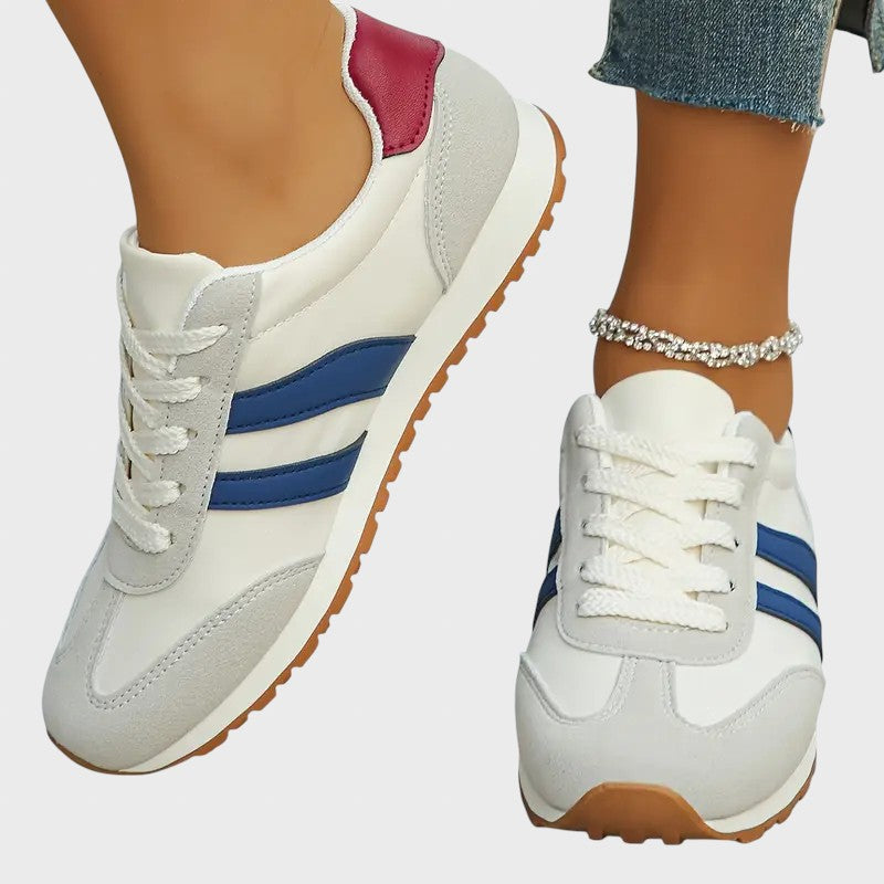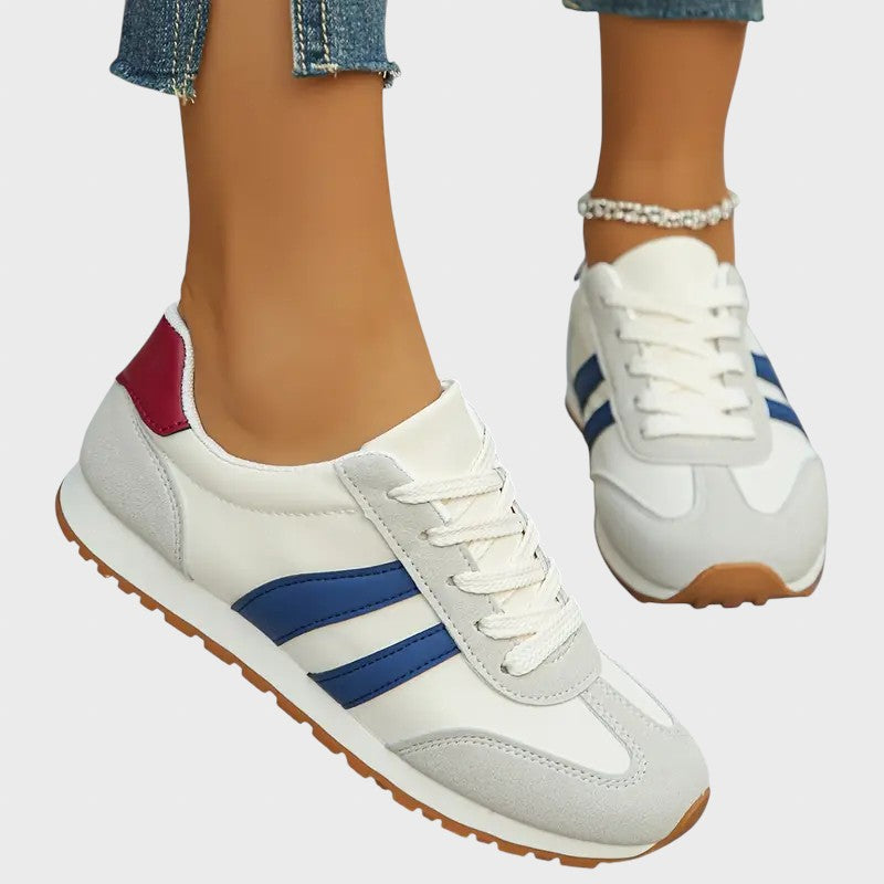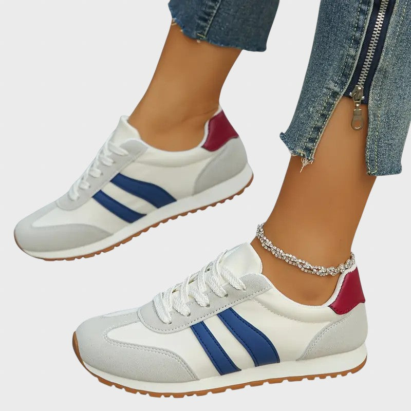 - Ярки контрастни детайли: Основната част в неутрални тонове е акцентирана от сини странични ивици и бордо или наситено червен детайл на тока.